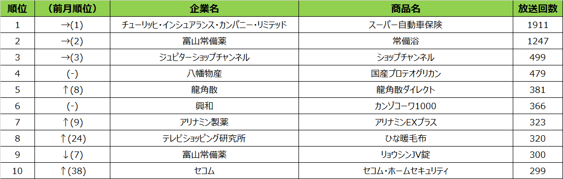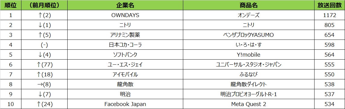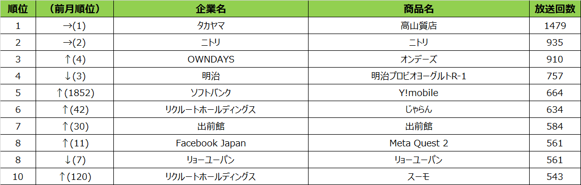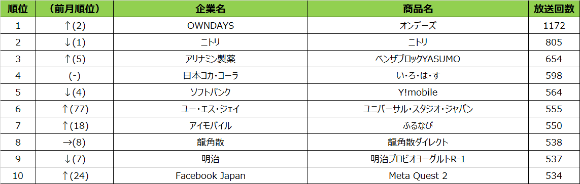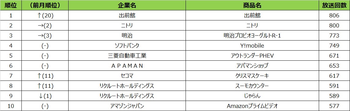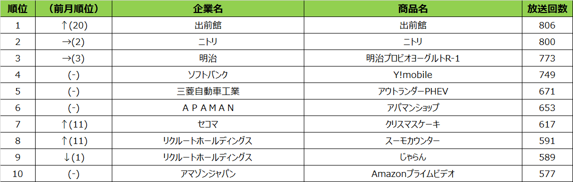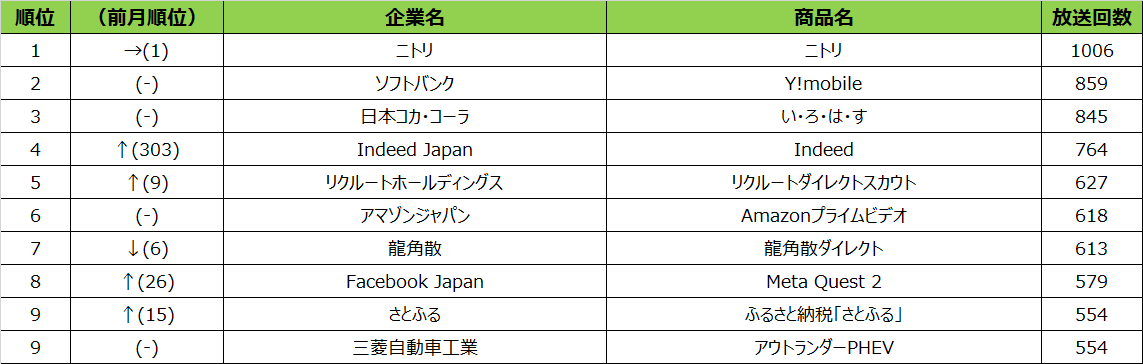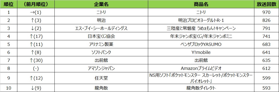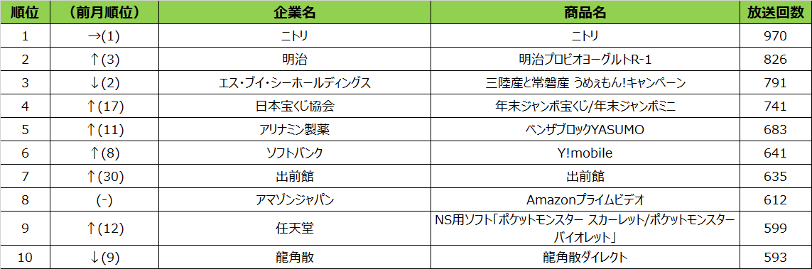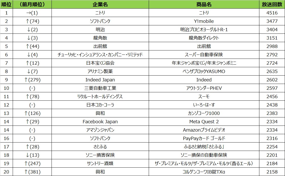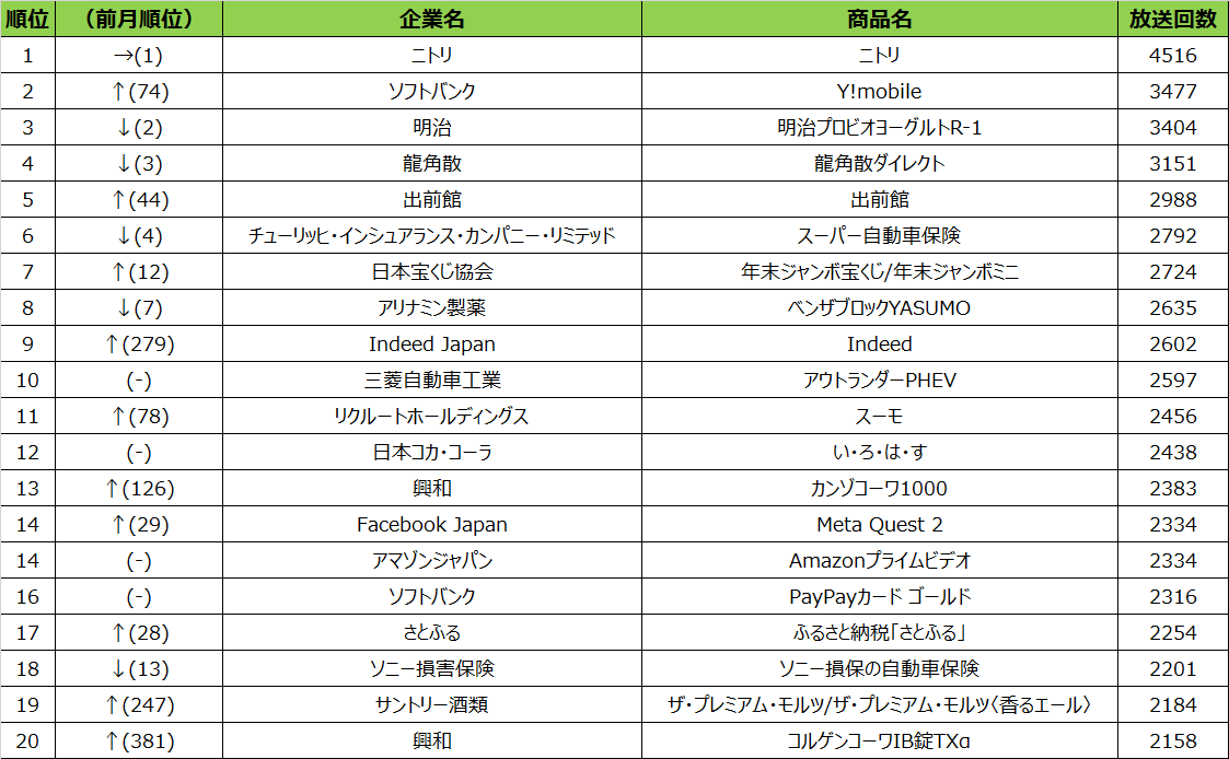 2022年12月度テレビCM放送回数ランキング発表~ニトリが2か月連続で商品別ランキング1位に~