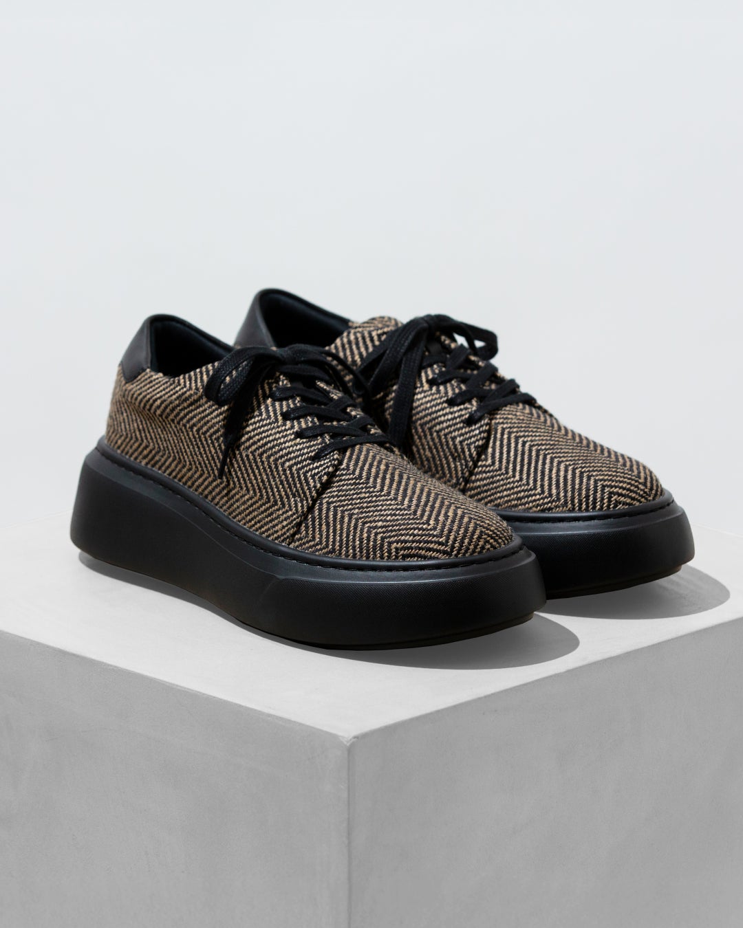 天然素材であるジュートを緻密なヘリンボーン柄に編み上げたこのモデルは、ブラックの落ち着きの中に独特の個性を添える一足です。レザーとは異なる軽やかな質感が、春夏のスタイリングに豊かな表情を与えます。