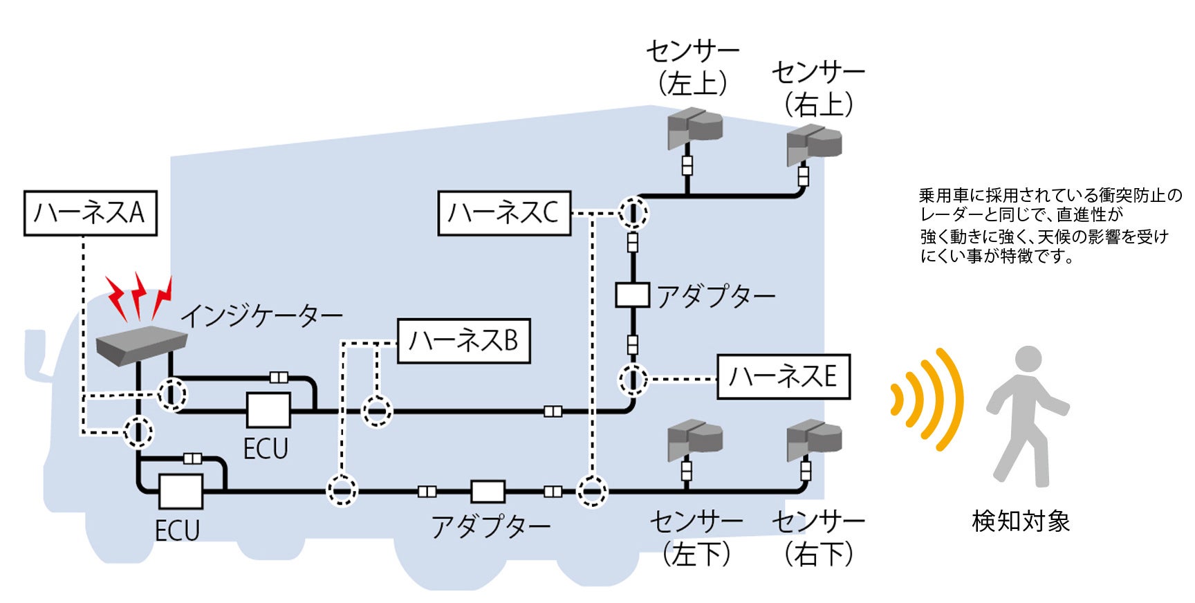 一般的な超音波センサーと比較して、雨や汚れ、対象物の形状などの影響を受けにくいミリ波方式※を採用しており、天候や使用環境に左右されにくい、安定した検知性能を実現しています。