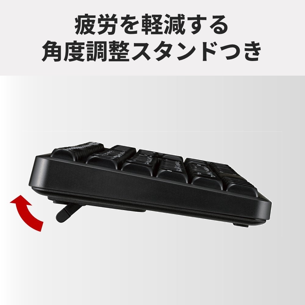音が気になる場所でも使いやすいタイピング音を抑えた静音機構を採用しています。キーはメンブレン方式のため、しっかりとした操作性を実現します。入力しやすい角度に調整できるスタンド付きで、使用時の疲労を軽減します。ドライバーインストール不要で、かんたんに接続できます。
