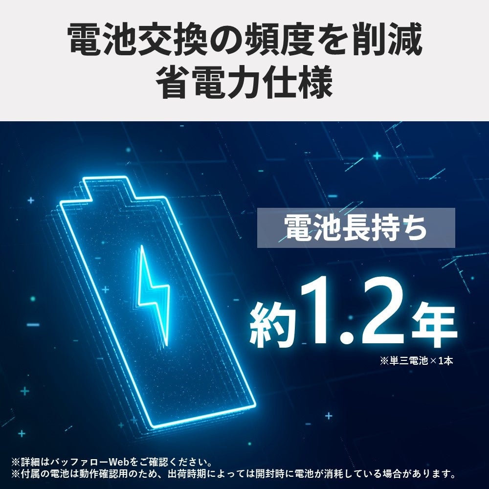 ※ 自然放電を考慮せず。アルカリ乾電池を使用。1日8時間のバソコン操作のうち、2時間をキーポードに割り当てた場合。当社計算値のため保証値ではありません。使用環境・状況によって異なります。
