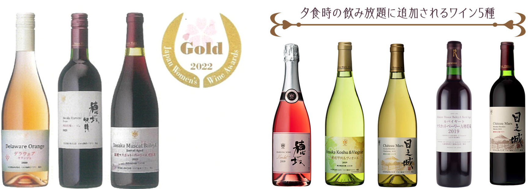 右:夕食バイキングでお楽しみいただける希少性の高い5銘柄。右端の「日之城メルロー」は、山梨を代表する醸造用葡萄の産地・穂坂地区にあるマルス山梨ワイナリーの自社農園で育てられたメルローを使って醸される1本。