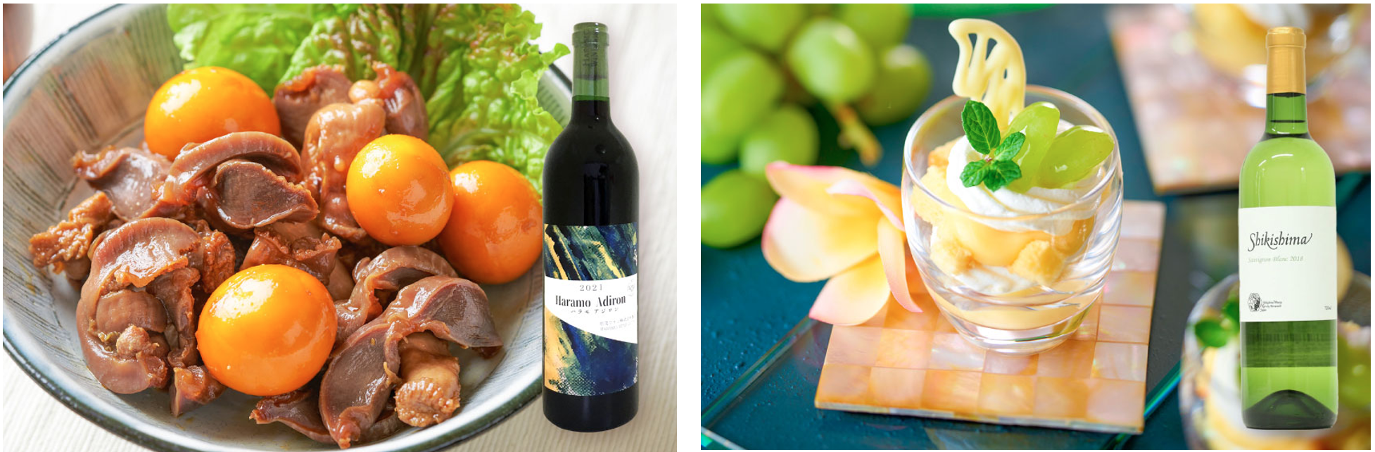 白ワインやスパークリングワインにぴったりの黒瀬ぶりのお造り、赤ワインの美味しさが際立つサーロインステーキなどのご馳走メニューの他にも、お試しいただきたいのは郷土料理・甲府名物 鳥もつ煮とのペアリング。