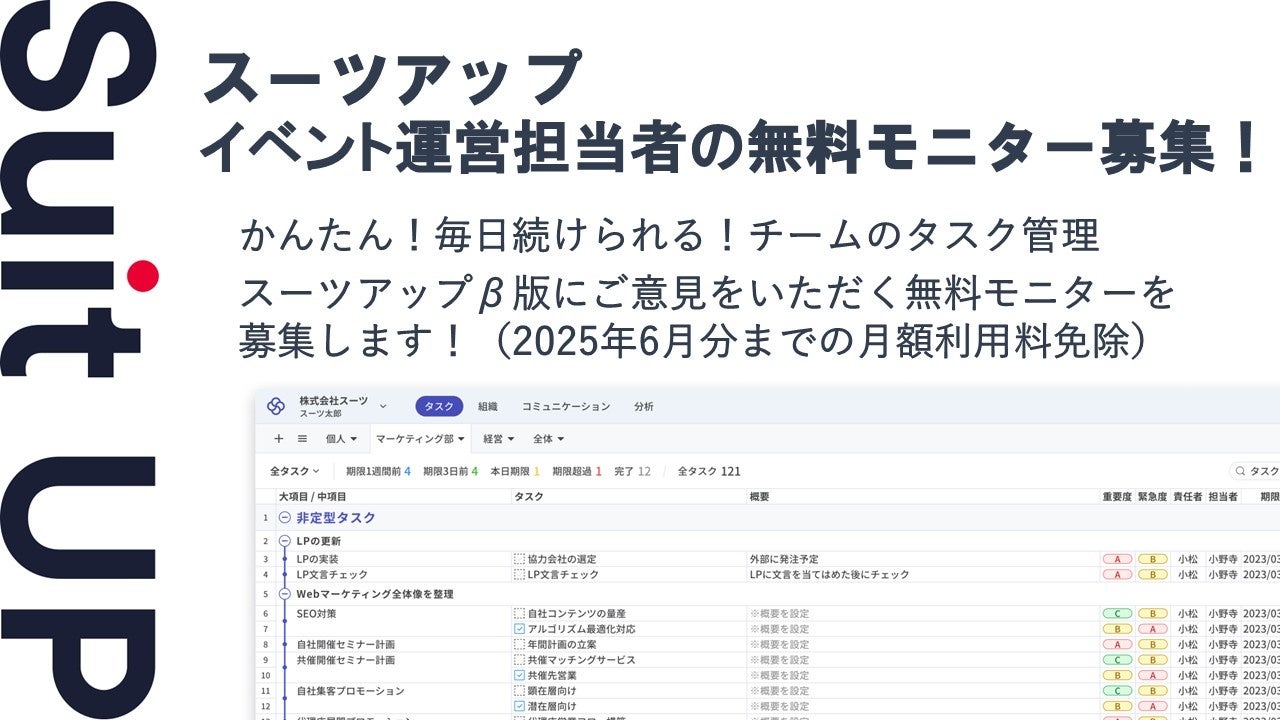 株式会社スーツ(所在地:東京都千代田区、代表取締役社長CEO:小松 裕介)は、チームでかんたん、毎日続けられるプロジェクト・タスク管理ツールの経営支援クラウド「Suit UP」(スーツアップ)において、イベント運営担当者の無料モニターを募集いたします。