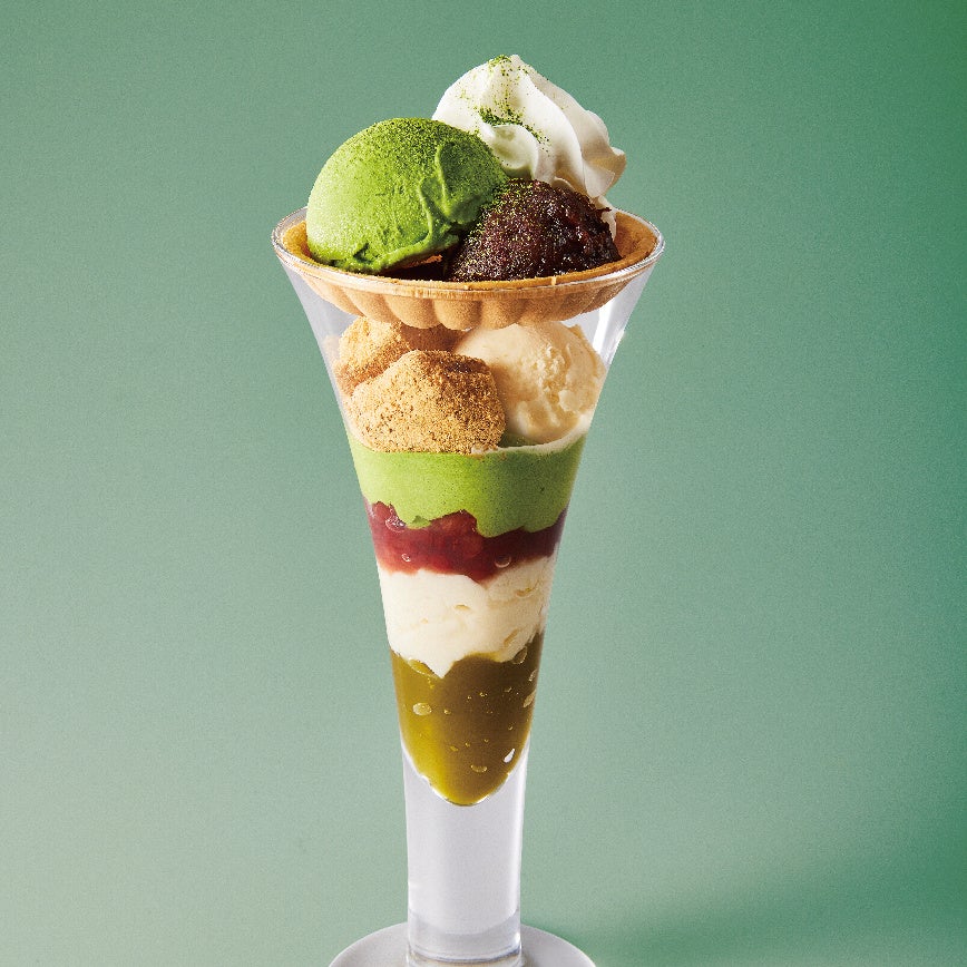 「袋布向春園」の抹茶やほうじ茶から作った風味豊かなゼリーをベースに、アイスや豆乳プリンなどのスイーツを“かわりばんこ”に味わえる和パフェです。抹茶ゼリーをベースにした「かわりばんこパフェ 抹茶」は、リニューアル前よりも抹茶の風味を感じられるようにレシピをブラッシュアップした他、わらび餅を加えたことでより満足感のあるパフェに仕上げました。ほうじ茶ゼリーをベースにした「かわりばんこパフェ 苺」は、ほうじ茶の香ばしさとチーズムースの酸味を感じる奥行きのある味わい。フレッシュな苺を使用しています。