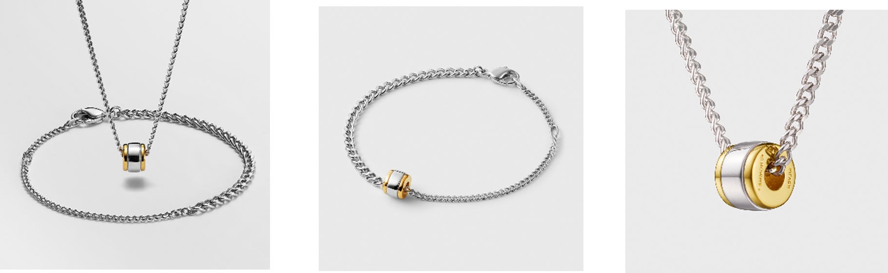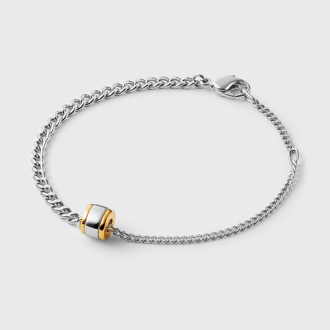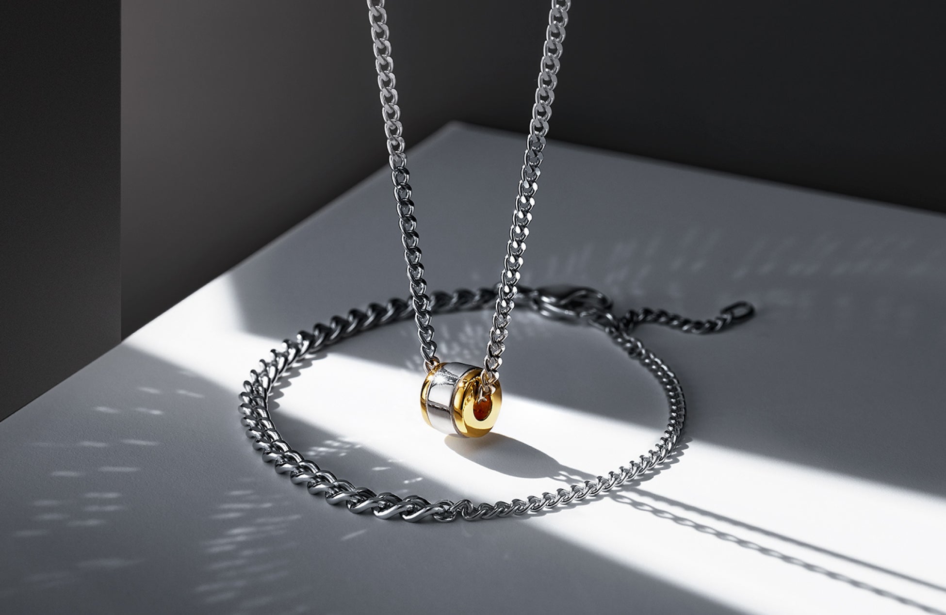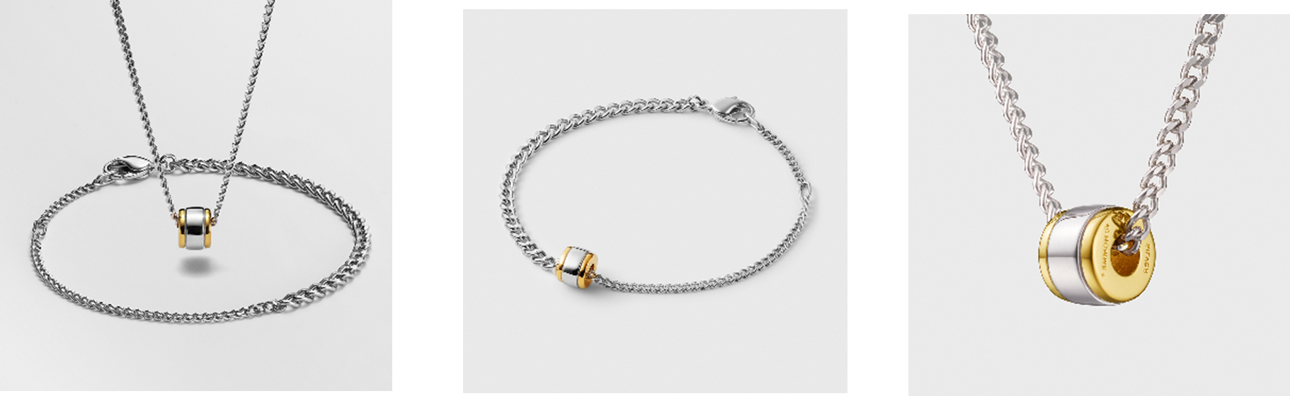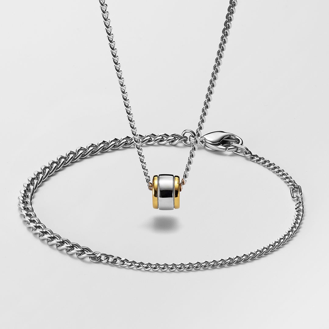 シルバーを基調としたブレスレットとネックレスのチェーンに、ゴールドカラーをアクセントにしたシックなフープパーツがセットになった特別なジュエリー。センター部分でチェーンのボリュームが変わるブレスレットは、シンプルな手元のアクセントとしてはもちろん、パーツを通すとチェーンの上で自在に動く小粋なデザイン。ネックレスに通せば、冬のシンプルな首元に程よい存在感をプラスします。
