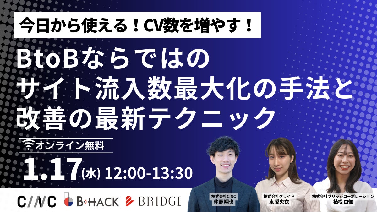 【1/17(水)開催】オンラインセミナー『【今日から使える!CV数を増やす!】BtoBならではのサイト流入数最大化の手法と改善の最新テクニック』