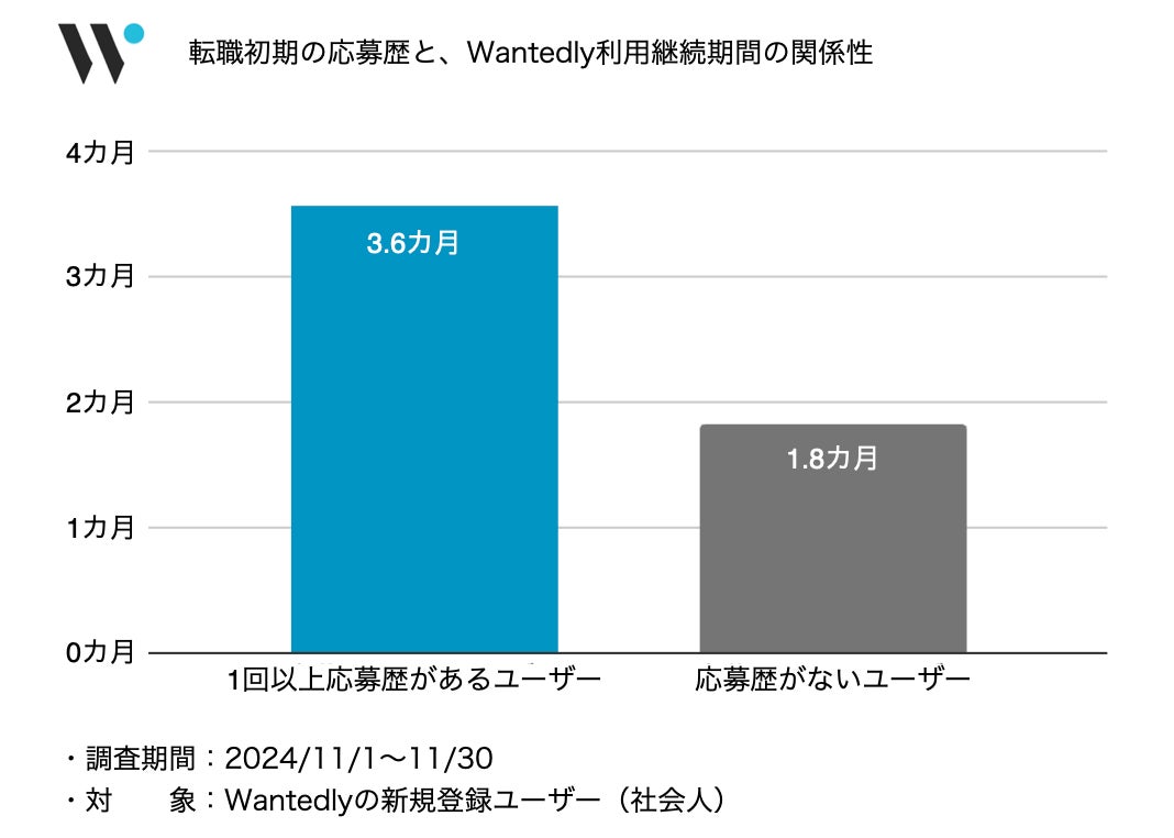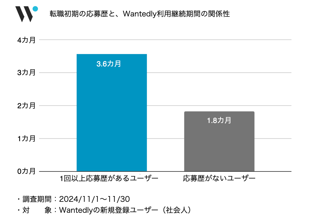 Wantedlyの社会人ユーザーを対象に利用状況を調査したところ、新規登録した月内に応募歴があるユーザーは、応募歴のないユーザーと比較して、サービス利用の平均継続月数が約2倍長いことがわかりました。このことから、転職を検討しはじめた初期に、一つでも自身とマッチする募集を発見できるか否かが、その後の仕事探しの継続に影響していると考えられます。キャリアAIエージェントにより、募集探しや選択を支援することで、Wantedlyの新規登録利用ユーザーの募集への応募率を年間で1.7倍向上させ、ユーザー1人ひとりにとっての適材適所との出合いをサポートします。