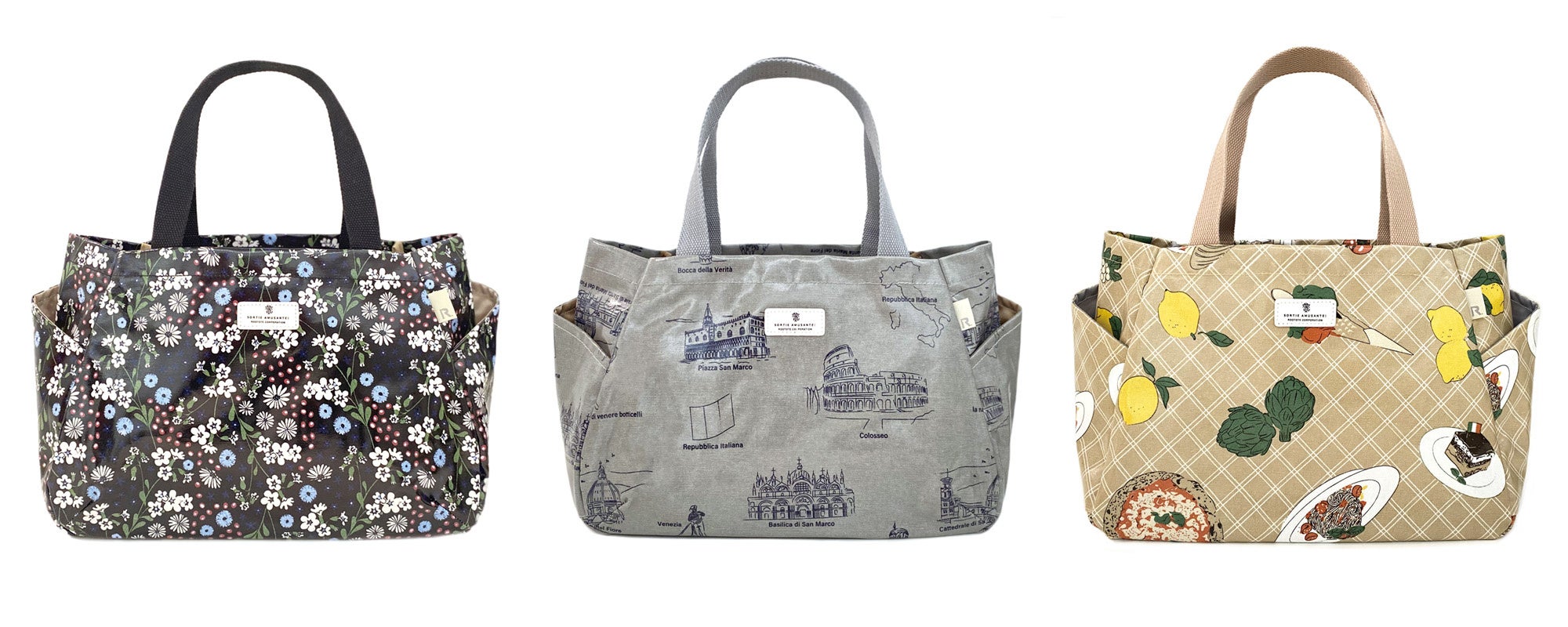 EU.デリ.パルーティ.ラミネート-E 4,290円(1460 01 Giardinaggio、02 Viaggio、03 Trattoria)サイズ:W32×H23×D14cm 持ち手:38cm 素材:表地/綿(ノンフタル酸PVCラミネート加工) 裏地/ポリエステル、ドットボタン 持ち手/ポリエステル ポケット:外側2箇所、内側3箇所(うちファスナー付1箇所)ホルダー2箇所 ※7月下旬より発売予定