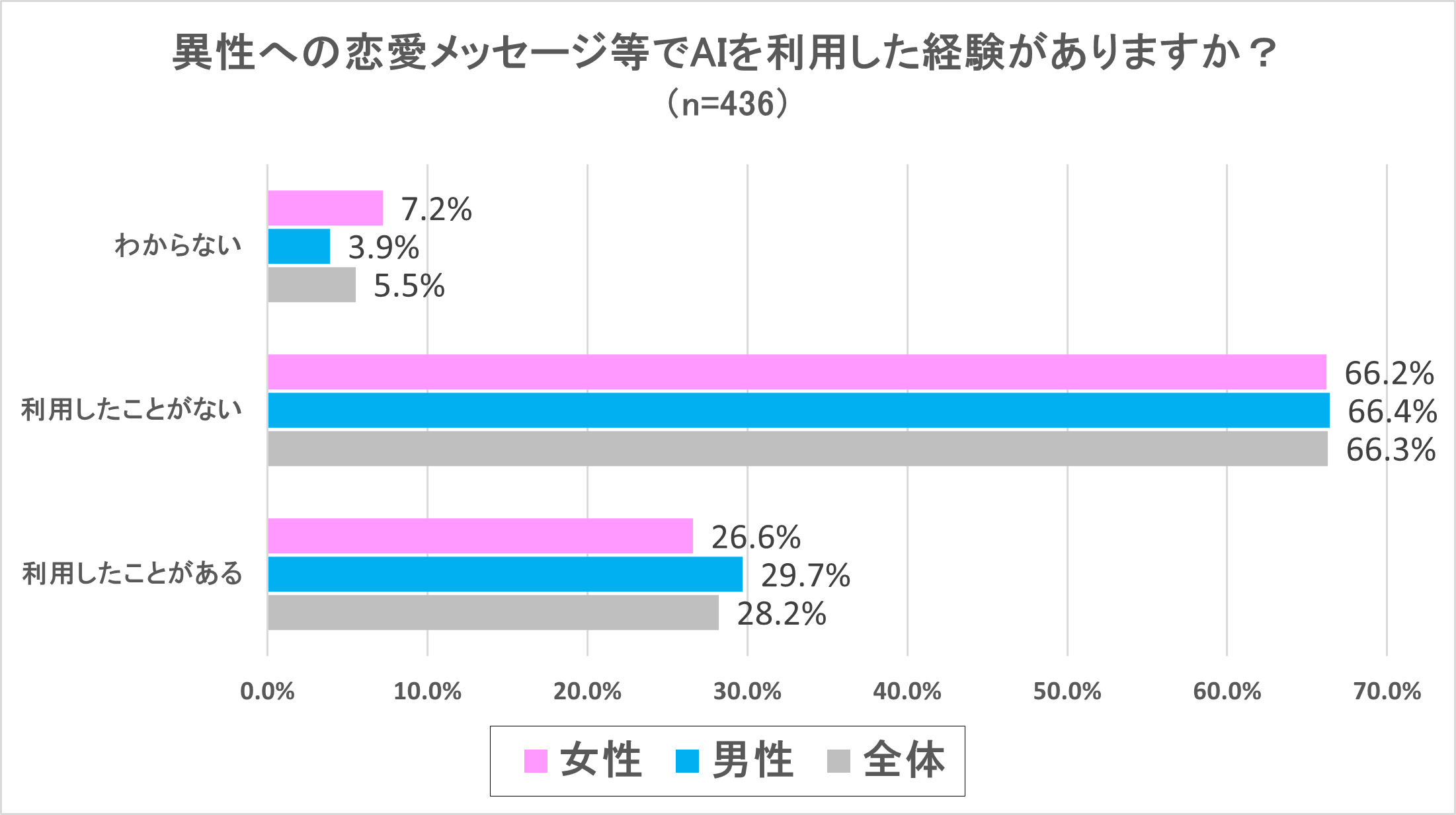 最初の設問で調査対象となる独身男女436人に「異性への恋愛メッセージ等でAIを利用した経験がありますか?」と質問しました。「利用したことがある」と回答したのは全体28.2%、男性29.7%、女性26.6%という結果で、「利用したことがない」が全体で66.3%、男性66.4%、女性66.2%となりました。