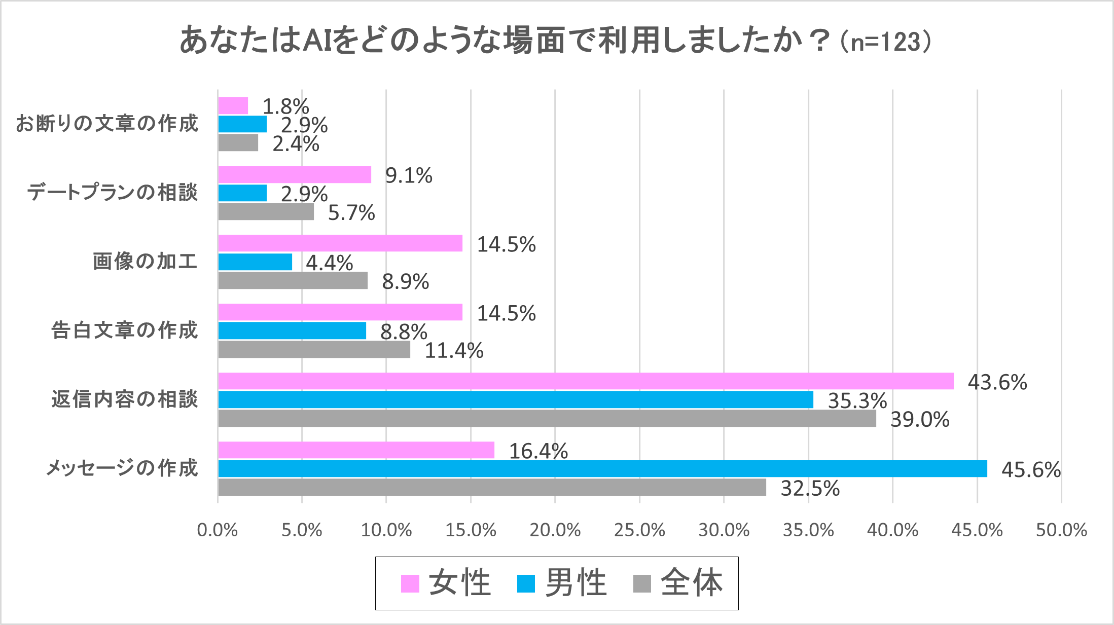 また、男女ともに回答割合が多かった「返信内容の相談」については、女性の方が利用割合が高い結果となり、スムーズなやり取りを目的に利用していることがうかがえる結果となりました。また、利用場面はそれほど多くはないものの「画像の加工」、「デートプランの相談」、「告白文章の作成」においても、男性より女性の方が利用割合が高い結果となりました。