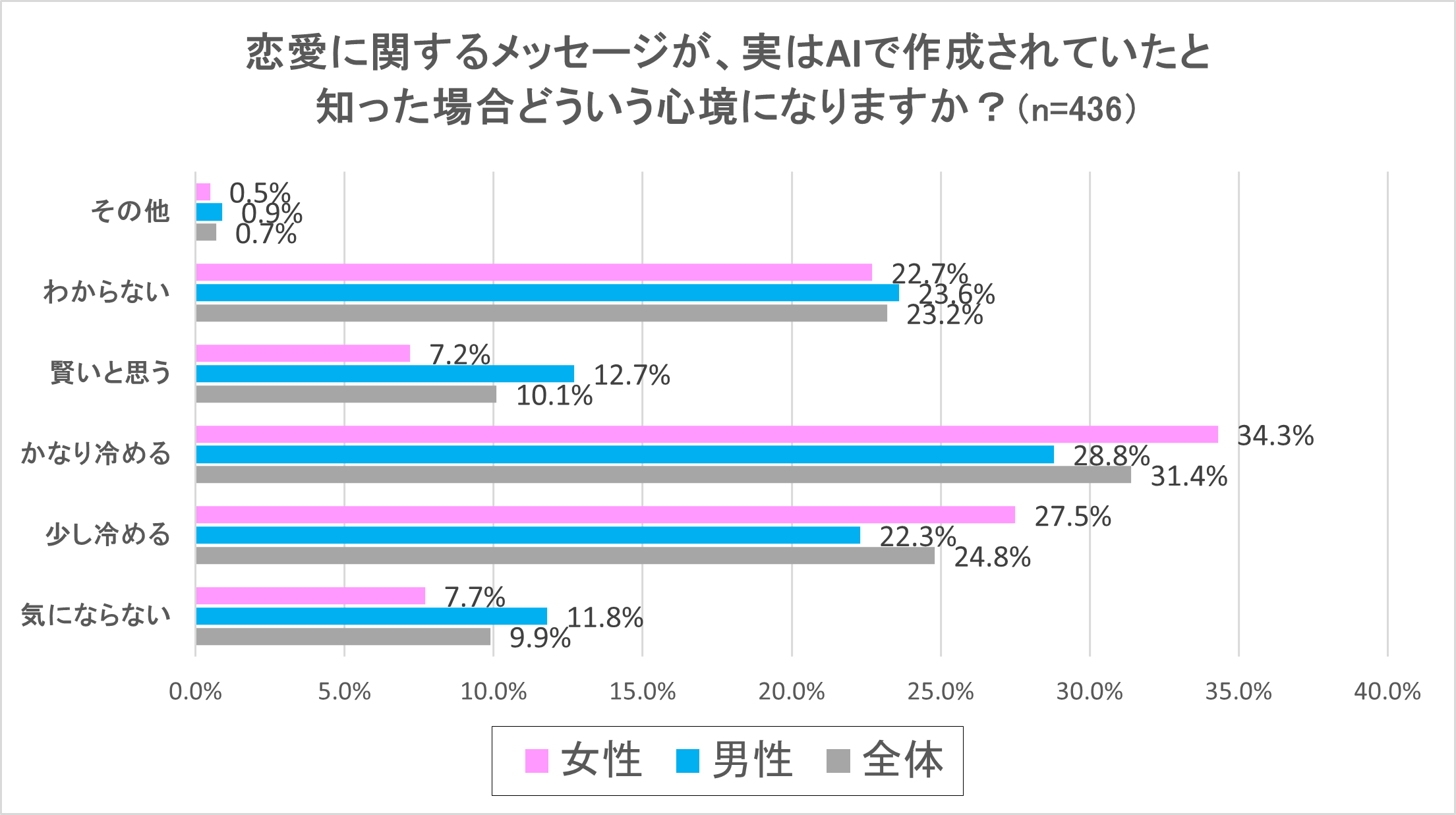 最後の設問で、「恋愛に関するメッセージが、実はAIで作成されていたと知った場合にどう思いますか?」と質問をしました。