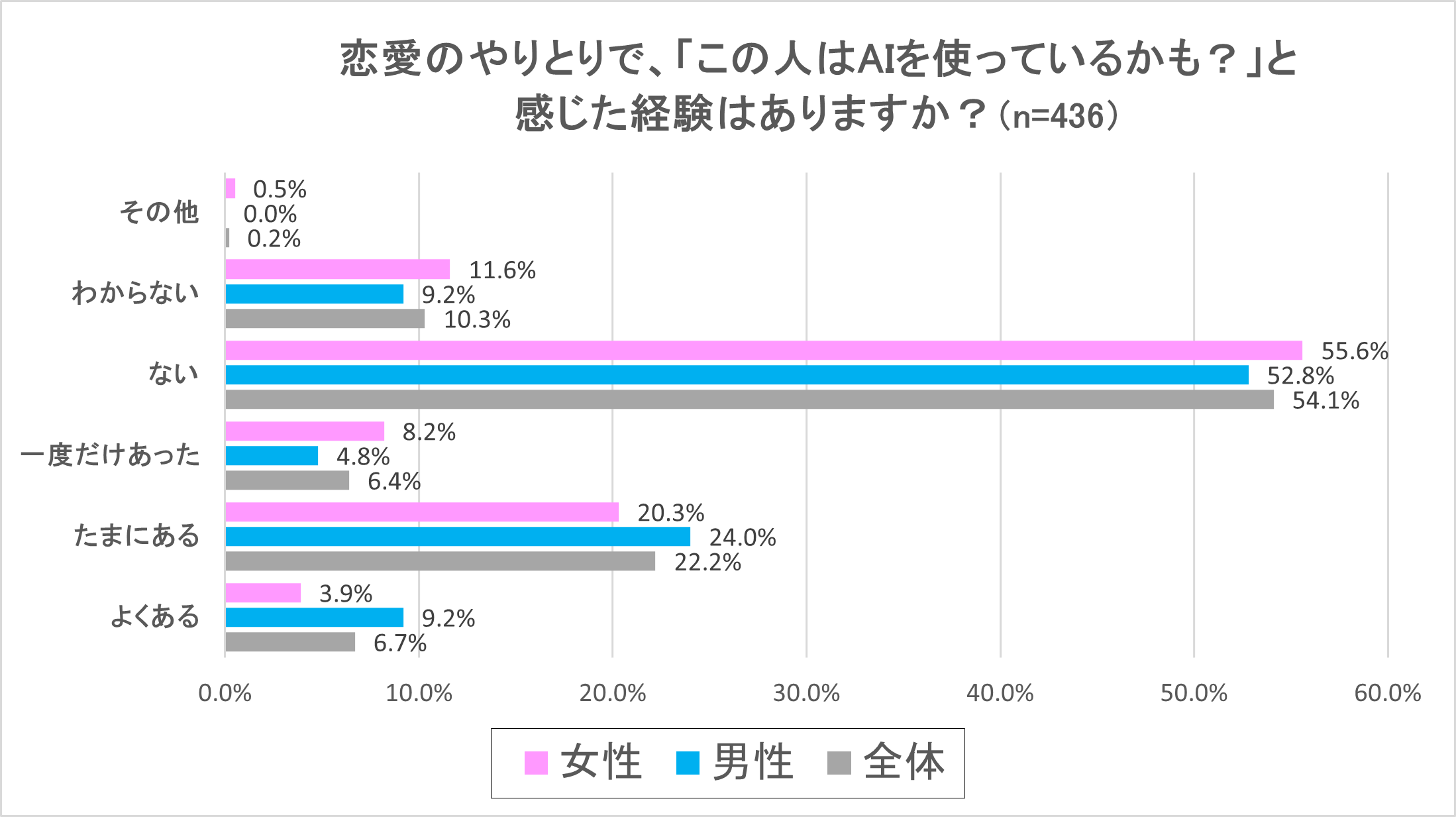 ■あなたは恋愛のやりとりの中で、「この人はAIを使っているかも?」と感じた経験はありますか?次の選択肢の中で最もあてはまる選択肢を1つ選んでください。