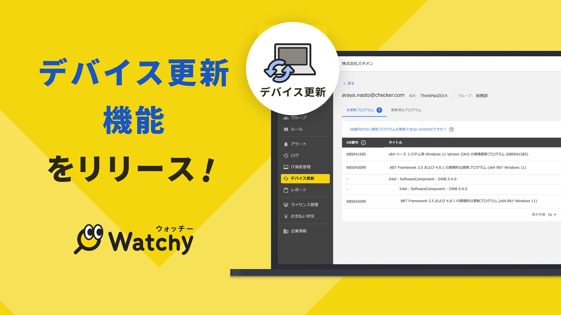 IT資産管理ツール「Watchy(ウォッチー)」、Windows Updateの更新状況を簡単に把握・管理し、脆弱性対策を強化できる新機能「デバイス更新機能」をリリース