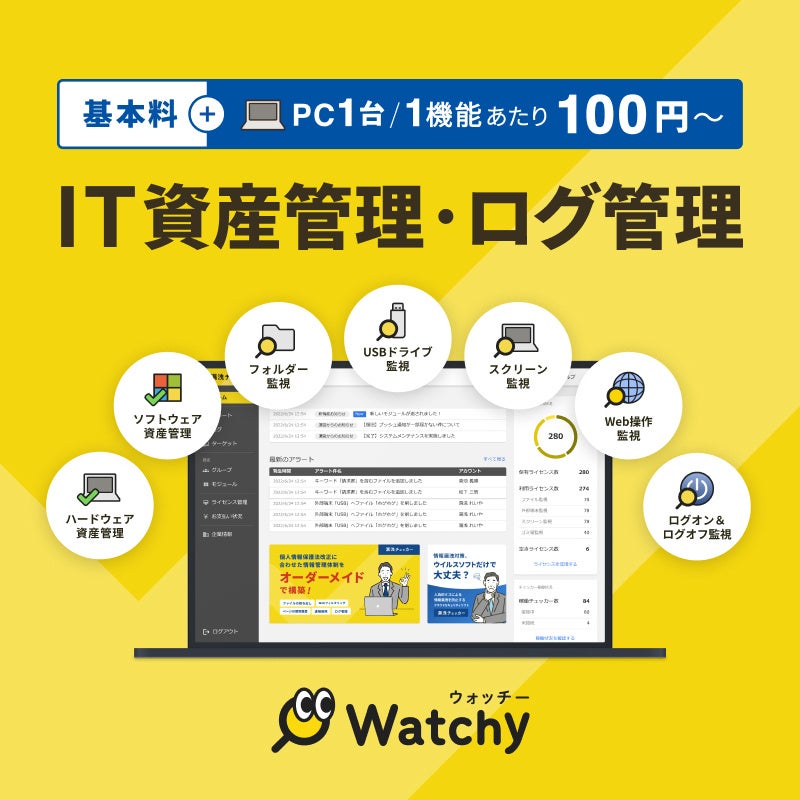「Watchy」とは、中小企業におすすめのクラウド型IT資産管理・操作ログ管理ツールです。必要な機能だけを選んで導入できるため、無駄な機能を契約することなく、低価格にスモールスタートできます。情シス担当でなくとも簡単に設定・運用できる管理画面のUIで、はじめてIT資産管理や操作ログ管理のツールを使う方にも使いやすいサービスとなっています。