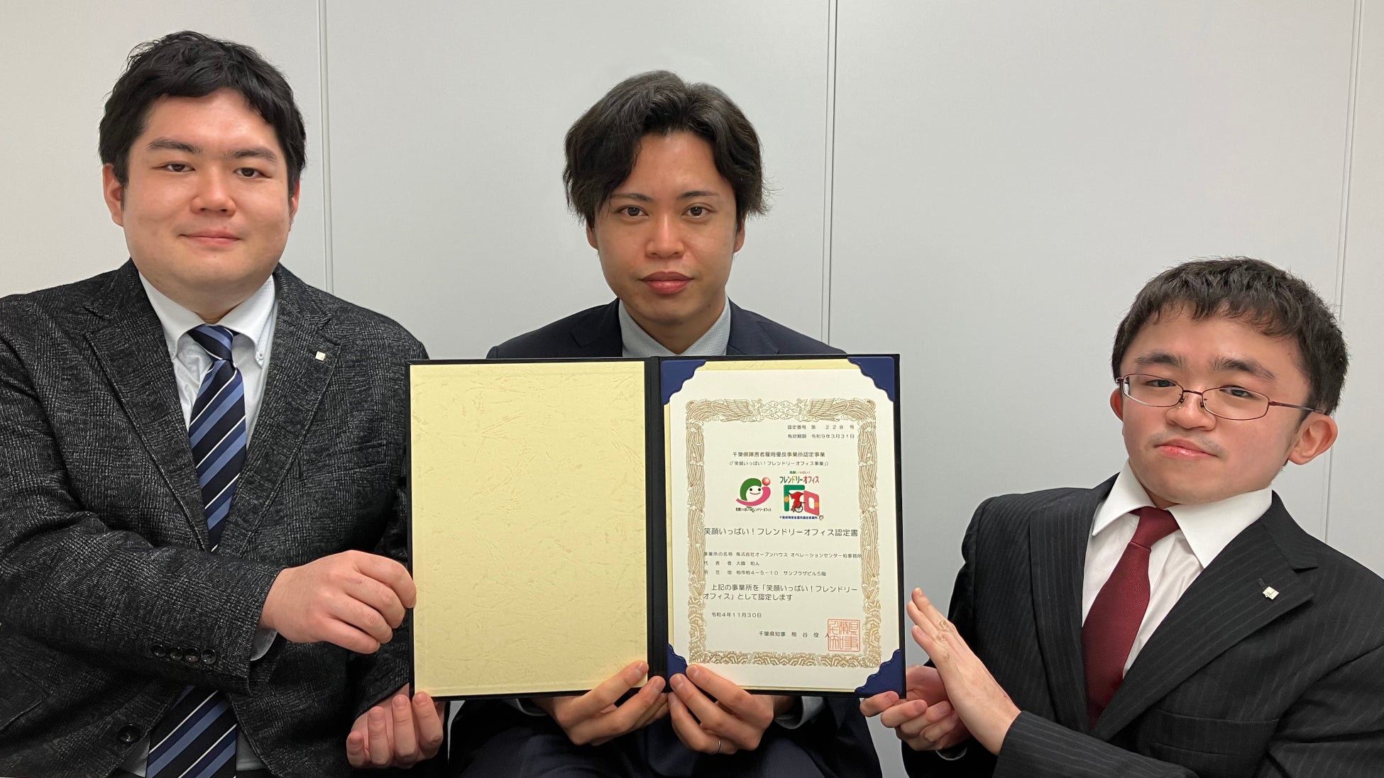 株式会社オープンハウスグループ(本社 東京都千代田区、代表取締役社長 荒井正昭、以下「当社」)の柏オペレーションセンターが、「笑顔いっぱい!フレンドリーオフィス」(千葉県障害者雇用優良事業所)に認定されました。