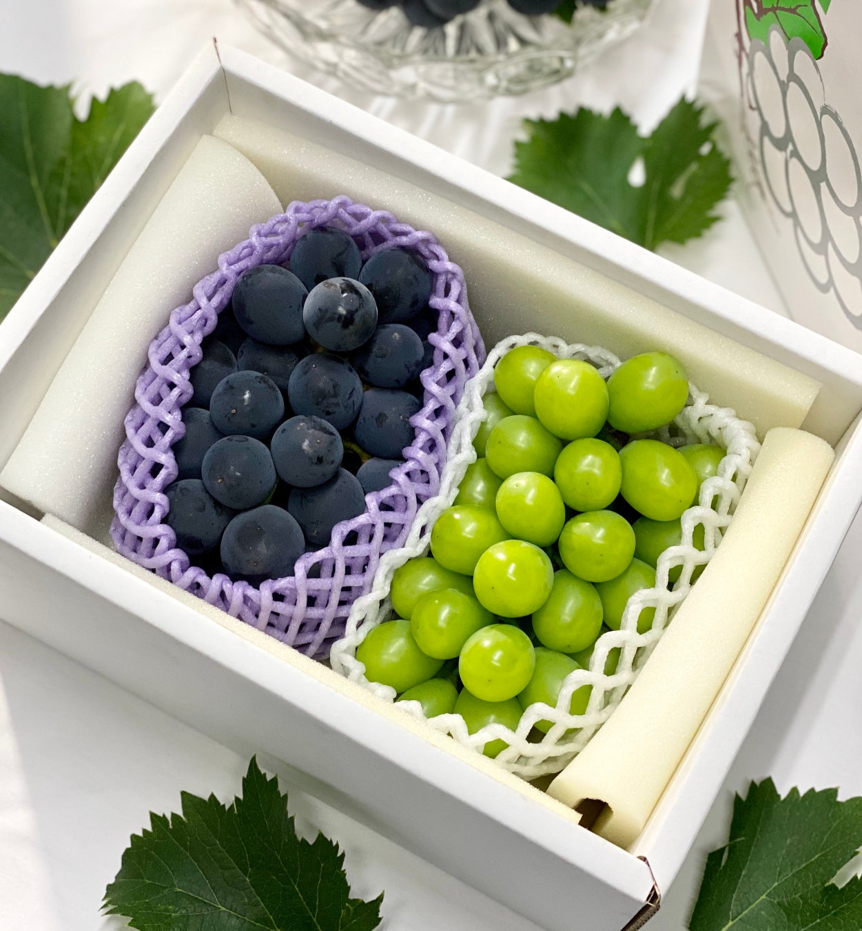 種無しで皮ごと食べれるシャインマスカットと種無しジューシーなニューピオーネのセット。マスカットの甘みとピオーネの爽やかな酸味を交互に味わっていたら手が止まらない...という声も。大粒な上に、見栄えの良さや荷崩れのしにくさなどを考慮した梱包も人気の理由の一つ。