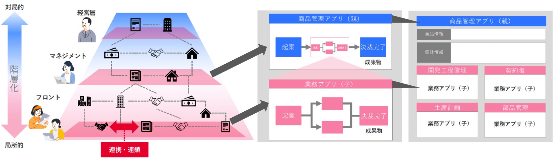 本機能は、大企業の複雑な業務構造を“業務のデジタルツイン”として完全ノーコードで実現するもので、組織の意思決定構造を強固に支え、大企業のデジタル変革を大きく前進させます。