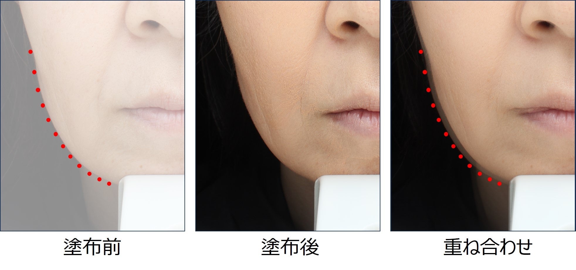 塗布直後に肌表面をリフトアップさせる技術は、水中油型(O/W型)のエマルションに、水分で膨らむ性質を持つ粘土鉱物と水溶性セルロース誘導体を配合することによって生まれます。肌に塗布した後に水分蒸散することで、粘土鉱物と水溶性セルロース誘導体が肌にピタッと密着し、皮膜を形成することによって肌に引き上げ感を演出するメカニズムです。当社は、これまで、ファンデーションなどのベースメイク品でもスキンケア成分を配合しやすい水中油型(O/W型)の処方にこだわって研究をしてきたため、この技術にたどり着いたと言えます。なお、この技術はエマルションタイプのファンデーションだけでなく、エマルションタイプのスキンケア品に配合しても同様の効果が得られると考えますが、内容物を肌から落とすことで引き上がり感の効果はなくなります。
