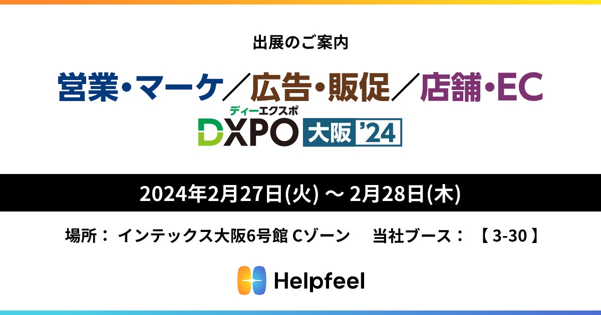 株式会社Helpfeel(京都府京都市、代表取締役/CEO:洛西 一周、以下 当社)は、2024年2月27日(火)〜2月28日(水)にインテックス大阪で開催される展示会「第2回 営業・マーケ/広告・販促/店舗・EC DXPO 大阪 ‘24」に出展することをお知らせします。