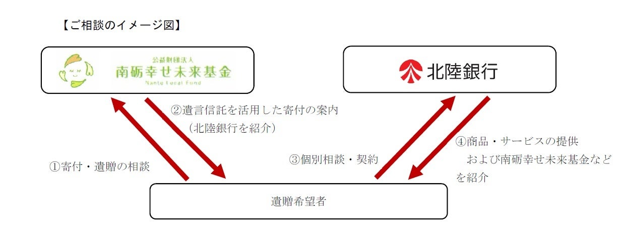これにより、南砺幸せ未来基金は遺言による寄付を希望される方に対して、具体的な相談先として当行を紹介いたします。当行は、相続・信託業務で培った知見を活かし、本部担当者が寄付や遺言作成の手続き等についてアドバイスを行い、必要に応じて、遺言信託などの商品・サービスをご提供いたします。また、当行からも、お客さまのご要望に応じて、寄付先として南砺幸せ未来基金をご紹介いたします。