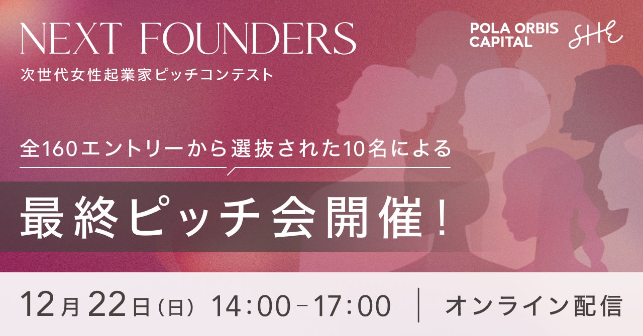 女性向けキャリアスクール「SHElikes(シーライクス)」の運営をはじめ、女性の社会進出と自己実現の支援に取り組むSHE株式会社(所在地:東京都港区、代表取締役CEO/CCO:福田恵里、以下SHE) は、株式会社ポーラ・オルビスホールディングス(本社:東京都中央区 社長:横手喜一、以下ポーラ・オルビスホールディングス)と協業で開始した次世代女性起業家の輩出を支援するピッチコンテスト「NEXT FOUNDERS」の最終ピッチ会を、12月22日(日)14時〜17時で開催します。