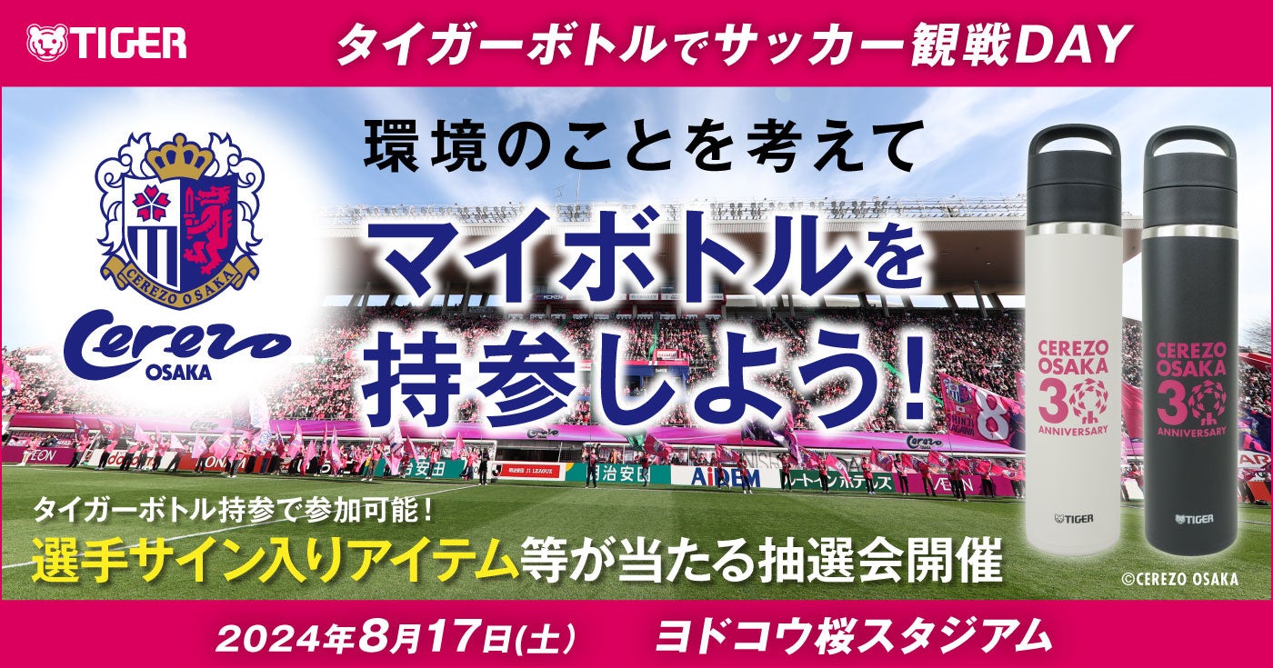 熱制御テクノロジーで世界をリードするタイガー魔法瓶株式会社(社長:菊池嘉聡、本社:大阪府門真市)は、プロサッカーチーム「セレッソ大阪」とコラボレーションし、マイボトルを持参してスポーツ観戦を楽しむスタイルを推奨する「タイガーボトルでサッカー観戦DAY~環境のことを考えてマイボトルを持参しよう~」を2024年8月17日(土)にヨドコウ桜スタジアムで行われる京都サンガ戦にて、開催いたします。