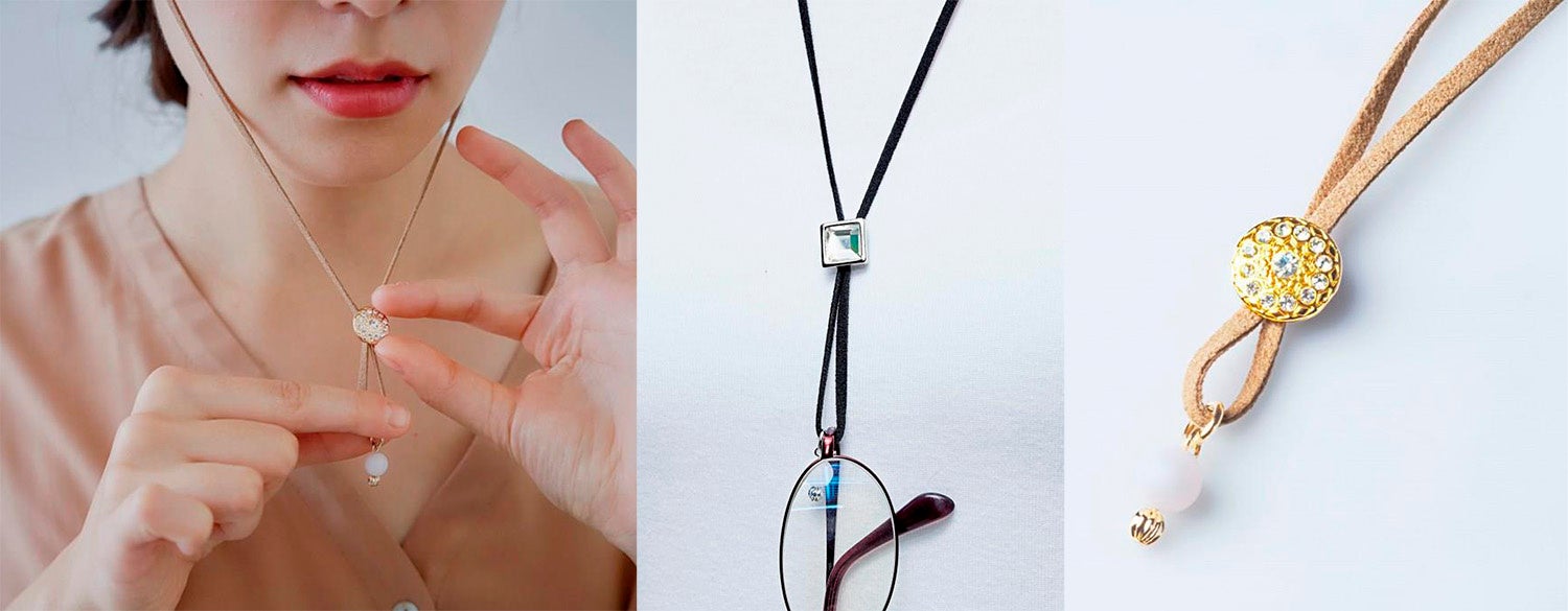 ビジューパーツで長さ調節OK。モチーフ部分にはメガネやサングラスを掛けることも可能。