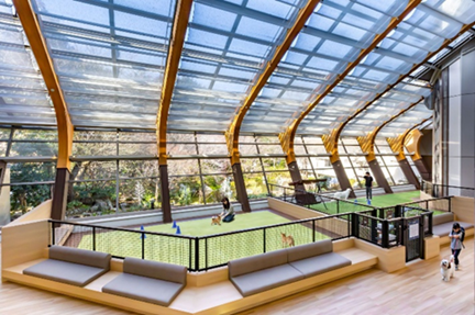 エリア随一の広さを誇る新しくなった屋内ドッグパーク。犬種別ゾーンに分かれており、天候を気にせず安全に遊ぶことができます。