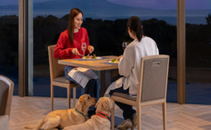 レストランは愛犬同伴OK。相模湾と伊豆大島を望む開放的な空間で、フレンチフルコースや愛犬用「わんこプレート」を一緒に楽しめます。リニューアルされたラウンジではドリンク飲み放題に加え、愛犬専用の甘酒・アイスも用意。