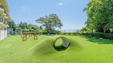 敷地内には広大な人工芝のドッグパークを完備。アジリティ設備やトンネルも備え、城ヶ崎の豊かな自然の中でわんちゃんが思いっきり体を動かせる環境が整っています。