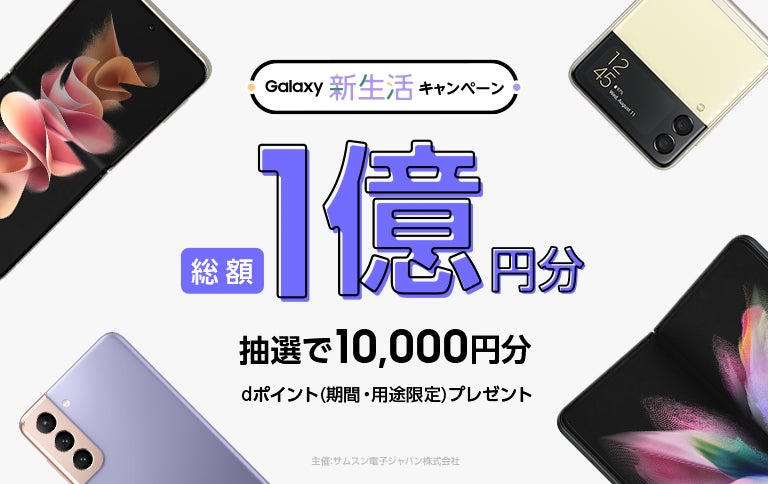 モバイル製品の世界的リーディングブランドであるGalaxyは、2022年2月18日(金)から3月31日(木)までの期間中に、ドコモ取扱店またはドコモオンラインショップ、ahamoにて、対象のGalaxyスマートフォンをご購入・ご応募された方の中から抽選で10,000名様に「dポイント10,000ポイント」※など10,000円相当をプレゼントする『Galaxy新生活キャンペーン』を開始いたします。また、ご当選されなかった方にも、プチギフト(500円相当)をプレゼントいたします。