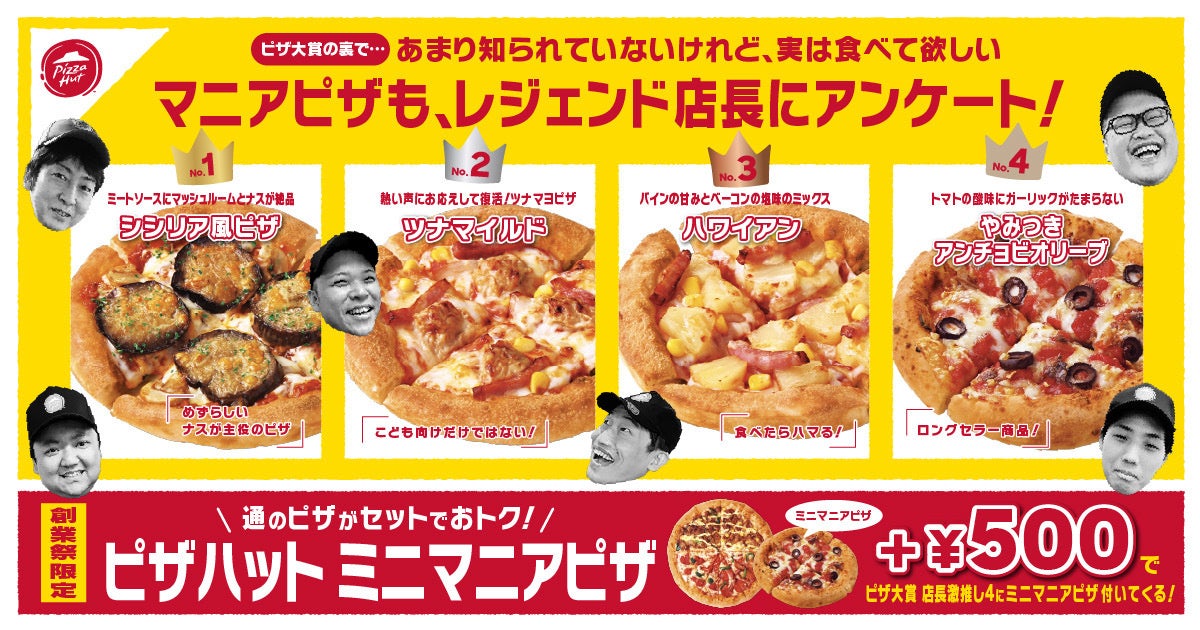さらに、「ピザ大賞 店長激推し4」を1枚ご購入いただくごとに、レジェンド店長たちから「実は食べてほしい」という声が多く寄せられた「4種のマニアピザ」をお試しサイズのミニマニアピザとして各1枚なんとたったの+500円(通常600円〜)でセットでお付けするという、超太っ腹企画も同時開催いたします!