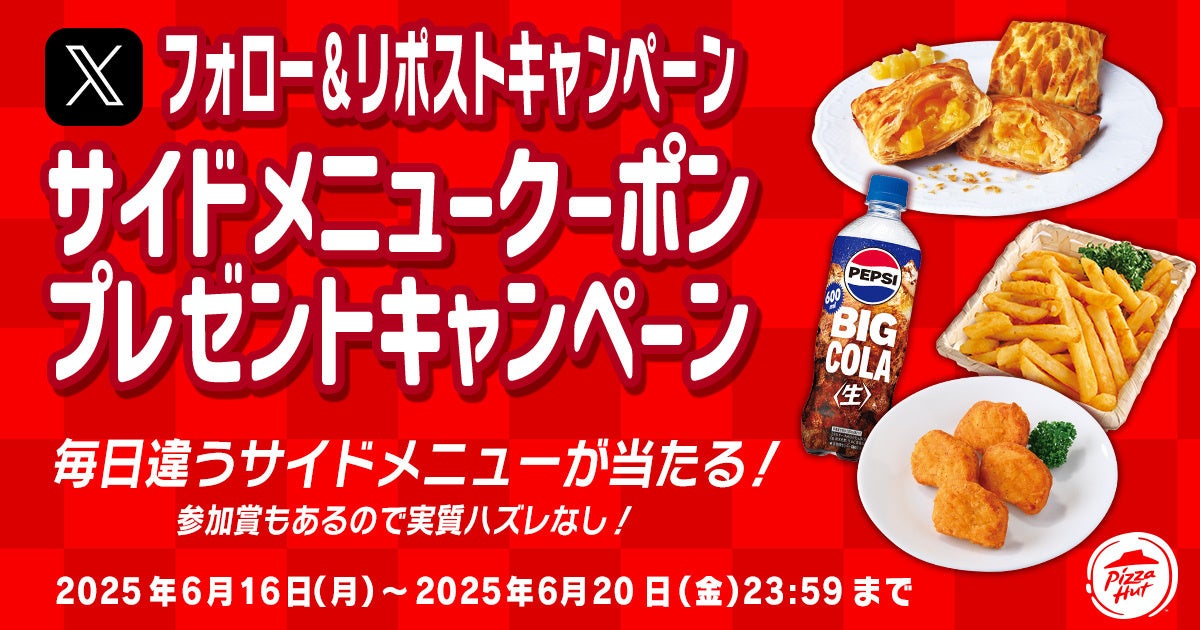 同時開催されるXのキャンペーンは、ピザハット公式アカウントをフォロー&キャンペーン投稿をリポストでサイドメニュークーポンをプレゼントいたします!参加賞もあるので、実質ハズレなしのキャンペーンでおトクにクーポンを手に入れよう!