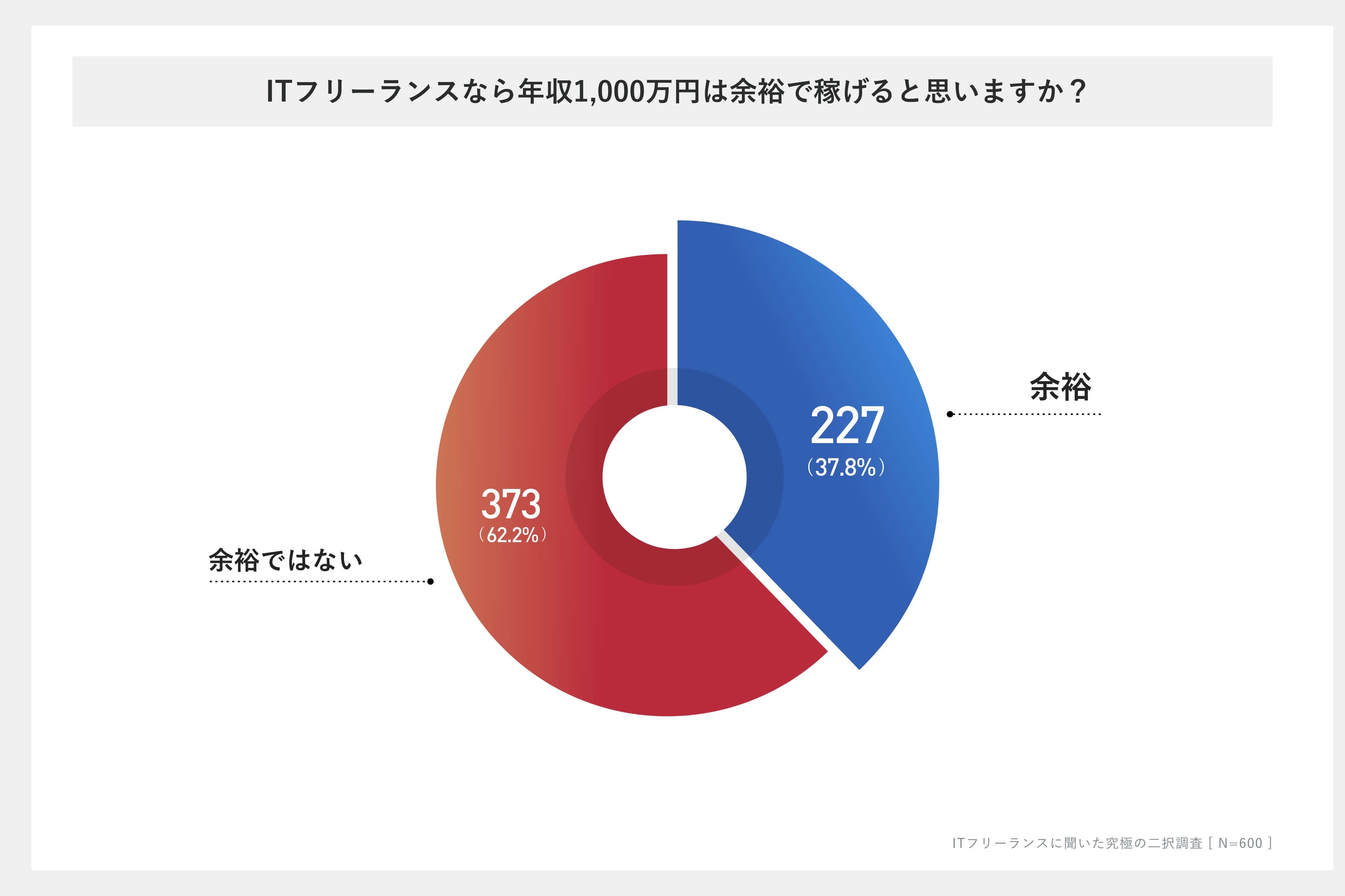 ITフリーランス600名に「年収1000万円は余裕で稼げると思うか」と尋ねたところ、「余裕(で稼げると思う)」と回答した人は227人(37.8%)にのぼりました。一方で、「余裕ではない」と回答した人は373人(62.2%)でした。