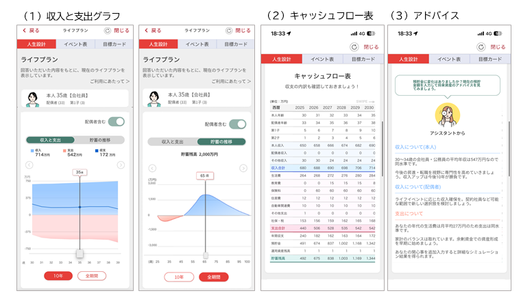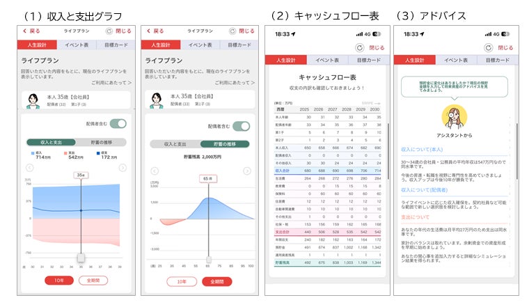 本機能では、お客さま一人ひとりに合わせた将来設計をサポートします。「人生設計」画面では、ご入力いただいた年収や生活費などの情報をもとに、将来の収支や貯蓄の推移を試算。詳細な金額が不明な場合でも統計値を活用して簡単に入力いただけます。