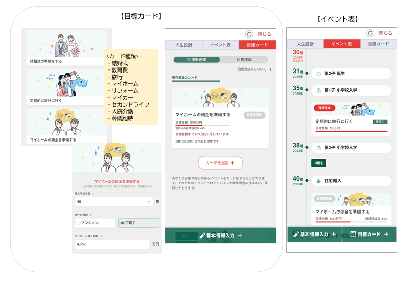 「目標カード」では、結婚式、旅行、マイホームなど、さまざまなライフイベントの目標金額を自由に設定し、イベントの発生する年齢時点で貯蓄が不足していないか確認できます。また「イベント表」では、将来のライフイベントを一覧で見ることができます。
