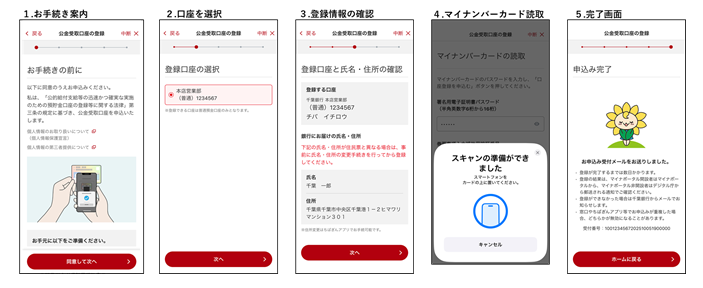 児童手当や年金などの給付金の受取にご利用いただける「公金受取口座」の登録申込ができます。本人確認はマイナンバーカードを利用した公的個人認証で行います。「公金受取口座」を登録しておくと、給付金の申請手続等において口座情報の記載や、通帳の写し等の添付等が不要になり、申請から受取までの手続きをスムーズに行うことができます。