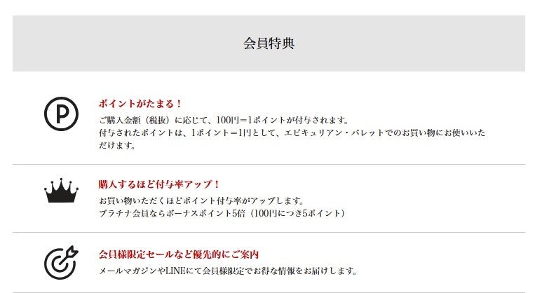 「エピキュリアン・パレット」の会員になると、今回の特典以外にも、お買い物がもっとオトクになる様々なサービスをご利用いただけます。