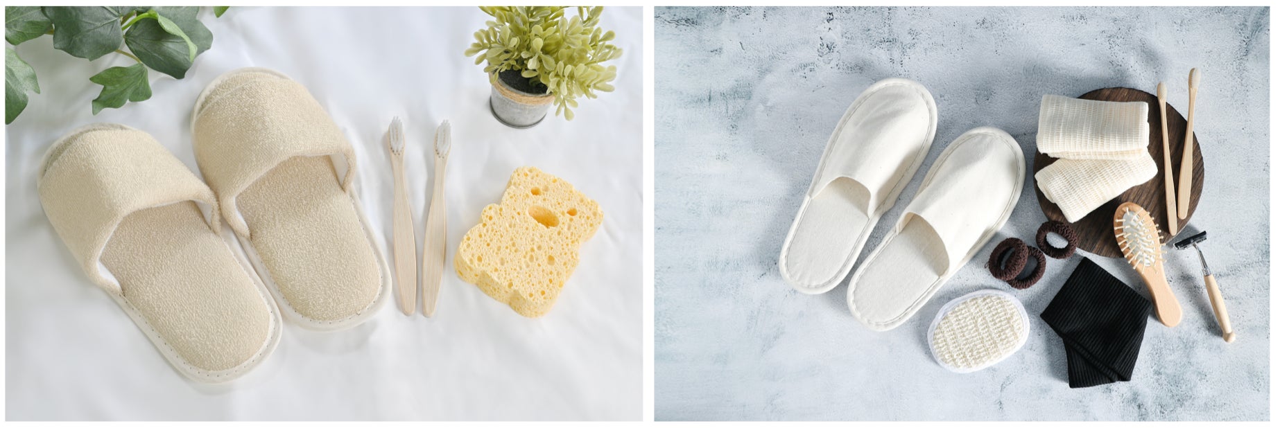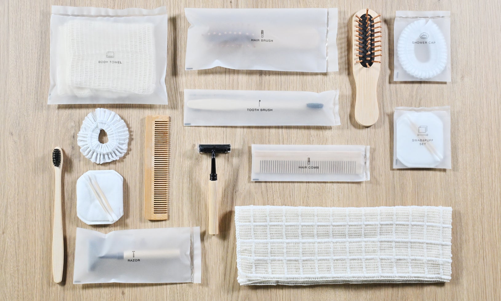 SUS amenityブランドでは、今回新発売される袋タイプアメニティ以外にも、素材ごと・パッケージごとなど、一式で導入いただけるシリーズ展開にこだわりを持っています。取り扱い種類も、定番アイテムである歯ブラシ・カミソリから、あったら嬉しい爪やすり・糸ようじ・ヘアゴムまで、品揃えが豊富です。スリッパなどの客室備品も展開しており、一式で集めると空間がより上質になるという声もいただいています。
