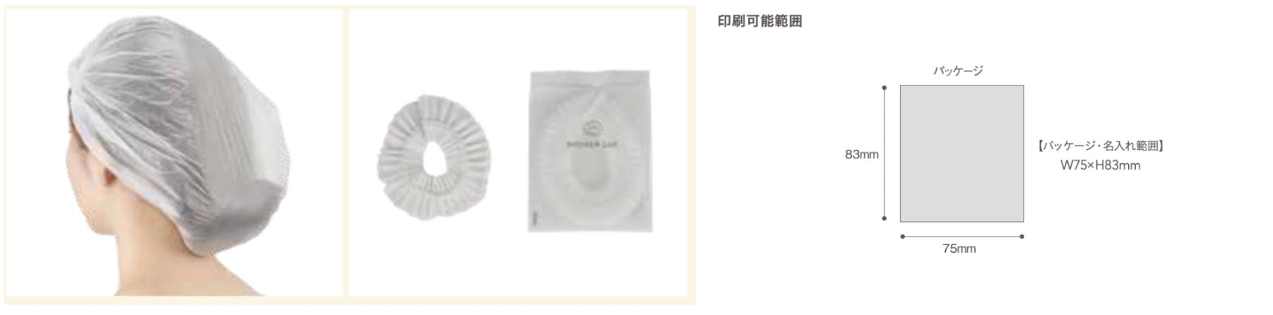 とうもろこし由来のエコ素材を使用したシャワーキャップ。バイオマス素材は、廃棄し焼却する際の排出物が温室効果ガスとは見なされず、地球温暖化防止につながります。サイズは開くと約25cmになるため、髪の長い女性でも安心してご利用いただけます。5,000個〜パッケージのオリジナル対応も可能です。