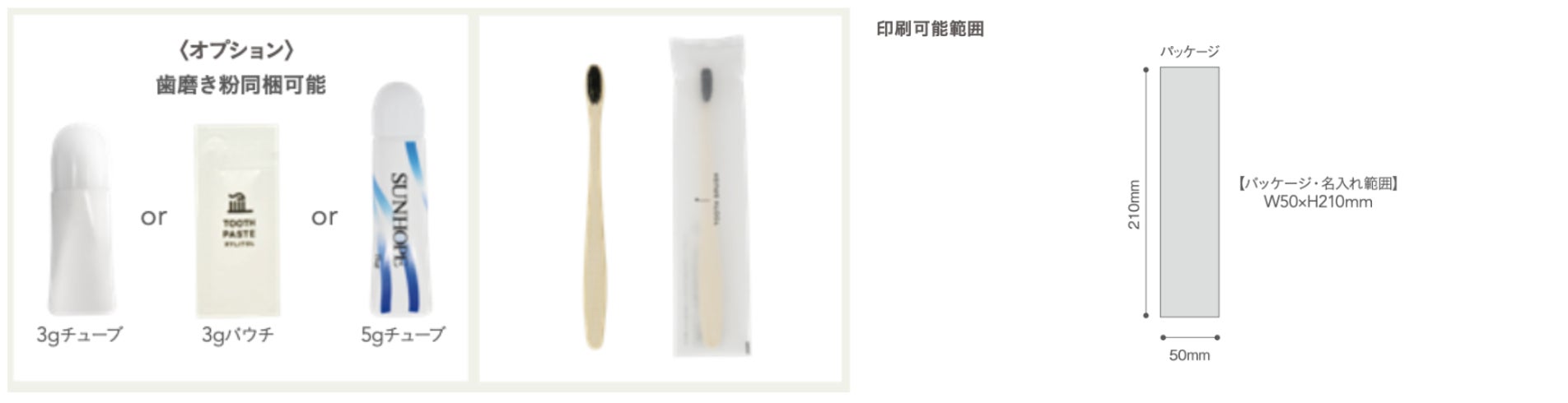 柄部分に天然の竹を使用した、全長180mmの歯ブラシ。竹素材はプラスチックよりも軽く、重さは9gです。ポイントはブラシ部分に黒色を採用している点で、シックで上品なデザインにこだわりました。オプションで歯磨き粉を同梱可能です。5,000個〜パッケージのオリジナル対応もできます。