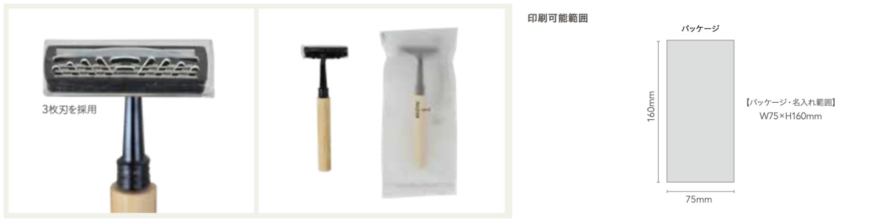 持ち手に天然の竹を使用した、全長120mmのカミソリ。ヘッド部分に黒色を採用しており、シックなデザインがおしゃれです。刃は小回りが効きやすい3枚刃を採用しております。5,000個〜パッケージのオリジナル対応もできます。