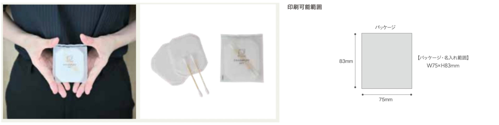 綿棒とコットンが2つずつ入ったアメニティセット。綿棒は持ち手に竹素材を採用しており、環境に優しい仕様を実現しました。さらにコットンは封入タイプで毛羽立ちにくく、大判のため使い勝手がよいです。5,000個〜パッケージのオリジナル対応もできます。