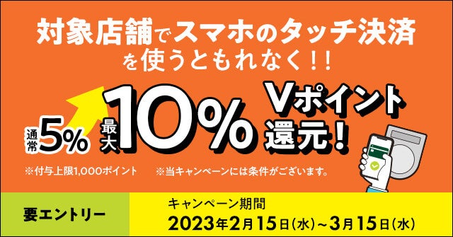 三井住友カード株式会社(本社:東京都江東区、代表取締役社長:大西 幸彦、以下:三井住友カード)は、2023年2月15日(水)より、対象飲食店でのApple Pay / Google PayTM のタッチ決済(Visaのタッチ決済またはMastercard®コンタクトレス)を対象とした「スマホのタッチ決済でVポイント最大10%還元!キャンペーン」を開始します。対象飲食店(※1)で、対象カードをスマートフォンに設定の上、タッチ決済にてお支払いいただくと、期間中の合計ご利用額200円(税込)につきもれなくVポイント10%(※2)を還元いたします。(付与上限1,000ポイントまで)