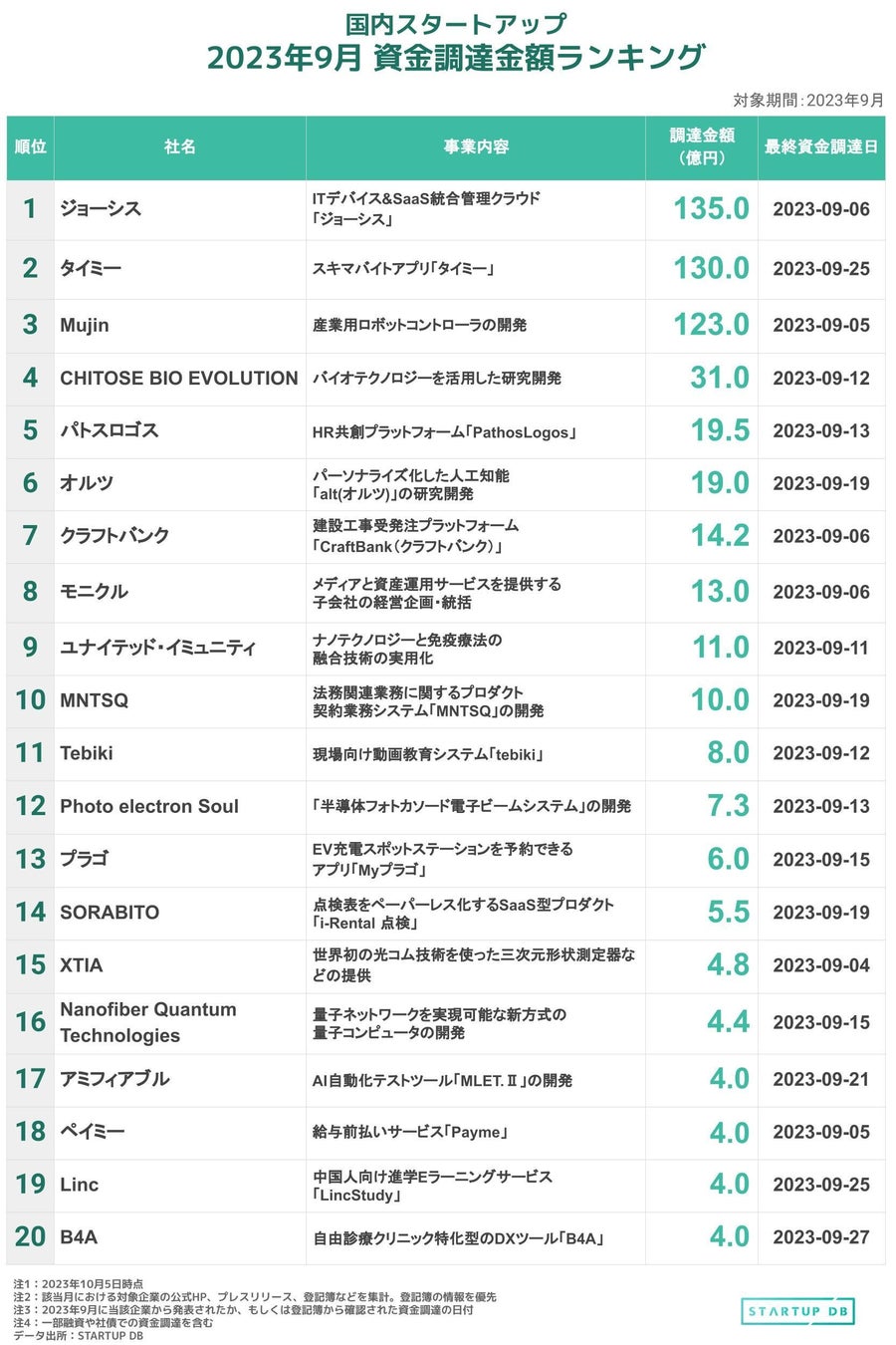 【STARTUP DB】調査結果 国内スタートアップ資金調達金額ランキング(2023年9月)