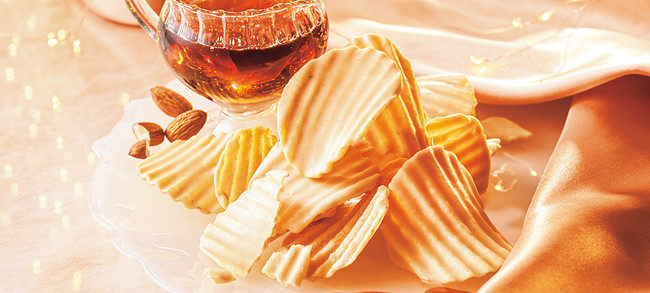 メープルシュガーとアーモンドペーストを加えたチョコレートを、ポテトチップの片面にコーティングしました。ほんのり塩味のポテトチップとやさしいメープルシュガーの風味が絶妙なバランスの、手が止まらなくなるおいしさです。後味にほんのりナッツが香ります。