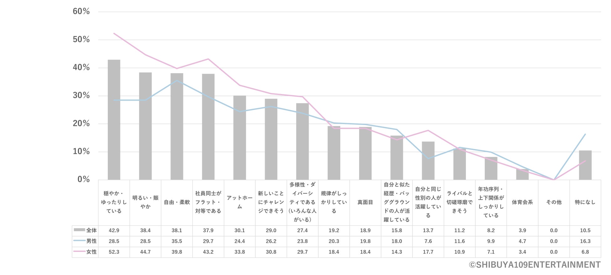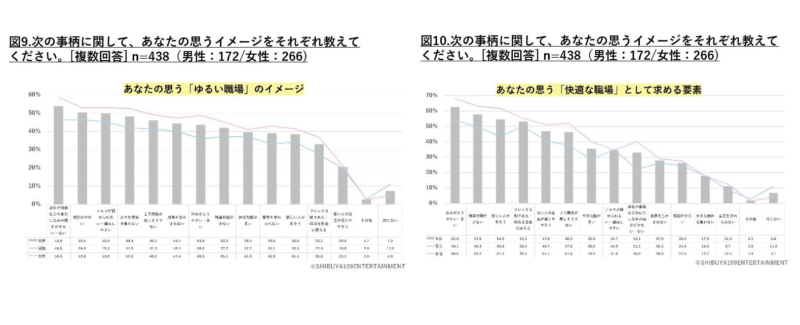 また、「『ゆるい職場』に魅力を感じる」※図8と回答したのは60.1% (男性54.7%、女性63.5%)になりましたが、「ゆるい職場のイメージ」※図9を聞いてみると、「髪色や服装などの身だしなみの規定が少ない・ない(53.9%)」「規則が少ない(50.5%)」「ノルマが課せられない・達成しやすい(50.0%)」「大きな責任を負わない(48.4%)」「上下関係が厳しそうでない(46.1%)」が上位にあがり、責任や成績が求められない環境だけではなく、労働規則が自由であることも重視されていることがわかります。