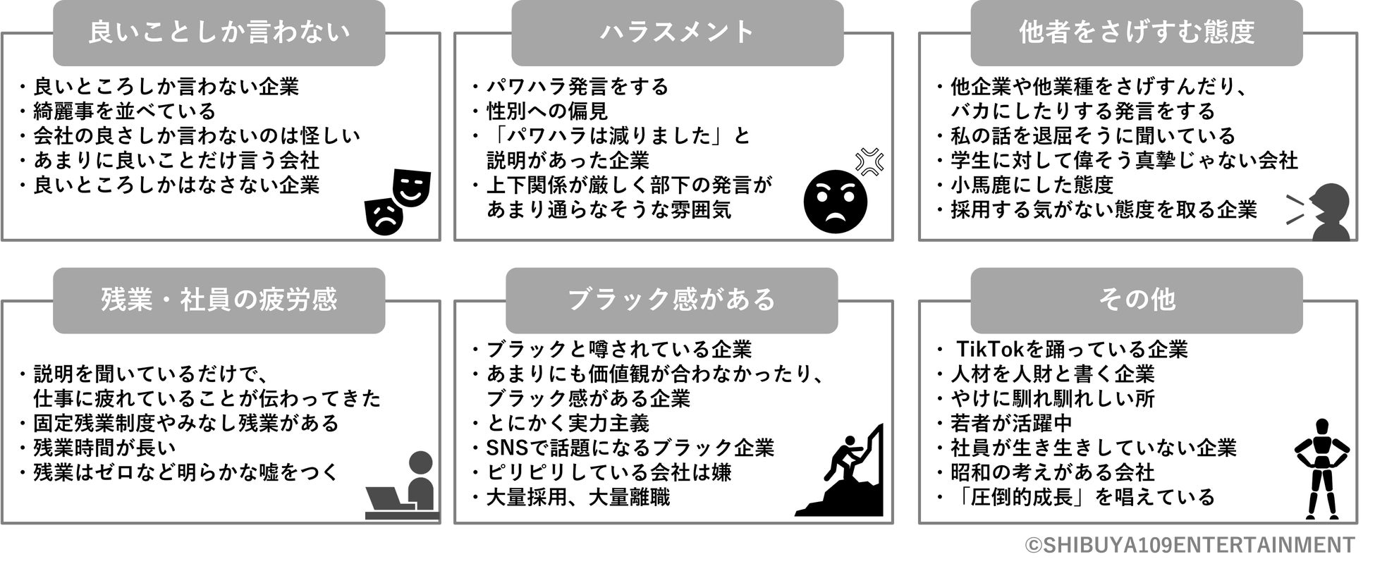 一方、「説明会や選考の中で『こんな会社は避けよう』『受けるのをやめよう』と感じた企業側の言動」について自由回答をテキストマイニングした結果※図12、「アットホーム」といった単語が目立ちました。その他実際の回答を見てみると「良いところしか言わない企業」「他企業、他業種をさげすむ、バカにする発言」「私の話を退屈そうに聞いている」などの回答がありました。