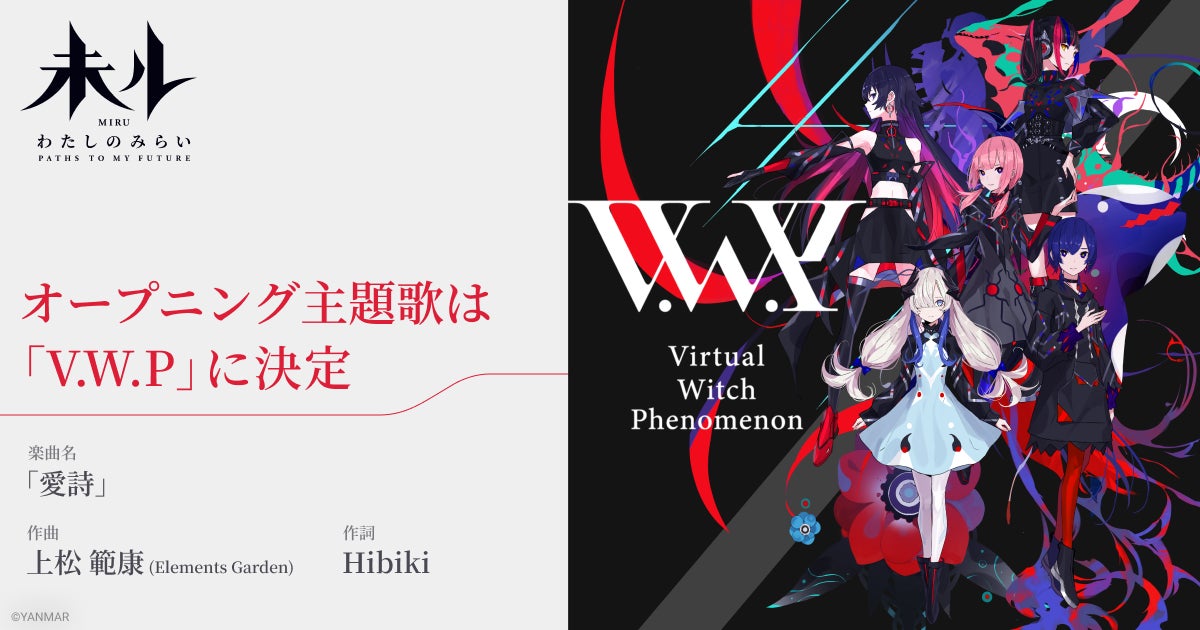 ヤンマーホールディングス株式会社が製作・プロデュースを手がけ、2025年4月に地上波放送予定のオリジナルアニメ『未ル わたしのみらい』のオープニング主題歌アーティストが「V.W.P」に決定しました。「V.W.P」は、若年層を中心に絶大な人気を誇るバーチャルアーティストグループで、楽曲名は「愛詩(読み方:あいうた)」です。本楽曲は、アニメのオープニングテーマとして書き下ろされた新曲となります。